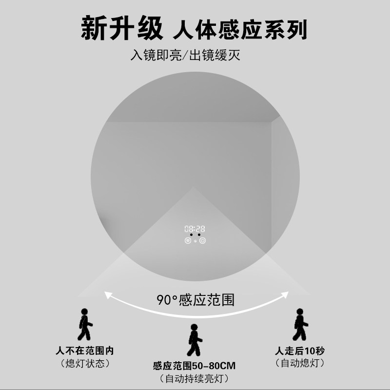 White light No touch anti-fog warm light No touch fog white light single touch anti-fog warm light single touch anti-fog white light double touch time temperature shows anti-fog warm light