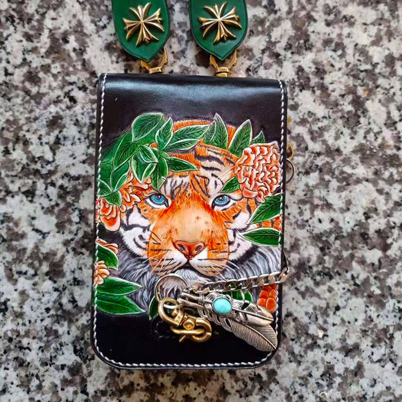 Handmade leather carved waist bag youth messenger bag men's and women's waist bag head layer leather vertical hook retro pattern tide brand