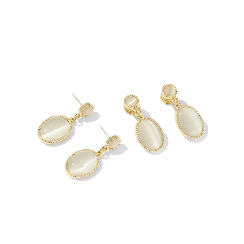 Oval Cat Eye Stone Earrings Temperament Superior Atmospheric Ear Pendant Long Version of Mosquito Coil Ear Clip Without Earhole Women's Style