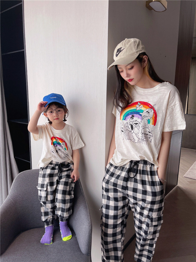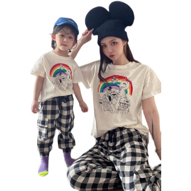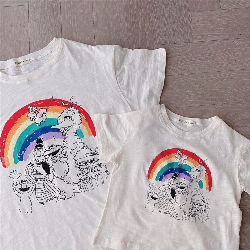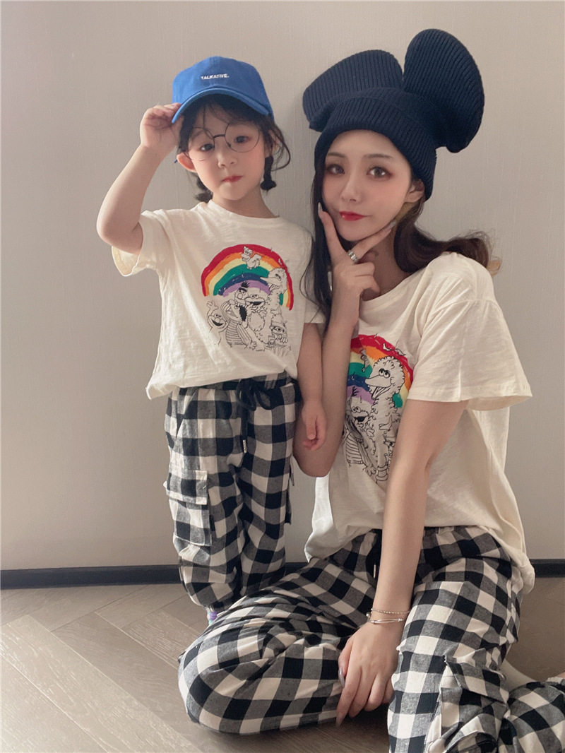 Fried street parent-child clothing family of three short-sleeved 2021 summer rainbow cartoon T-shirt net red mother-child mother-daughter bottoming shirt