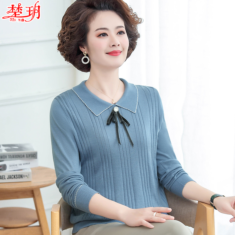 Mom spring long-sleeved top middle-aged and elderly women's lapel Western style knitted sweater middle-aged 40 years old 50 thin bottoming shirt