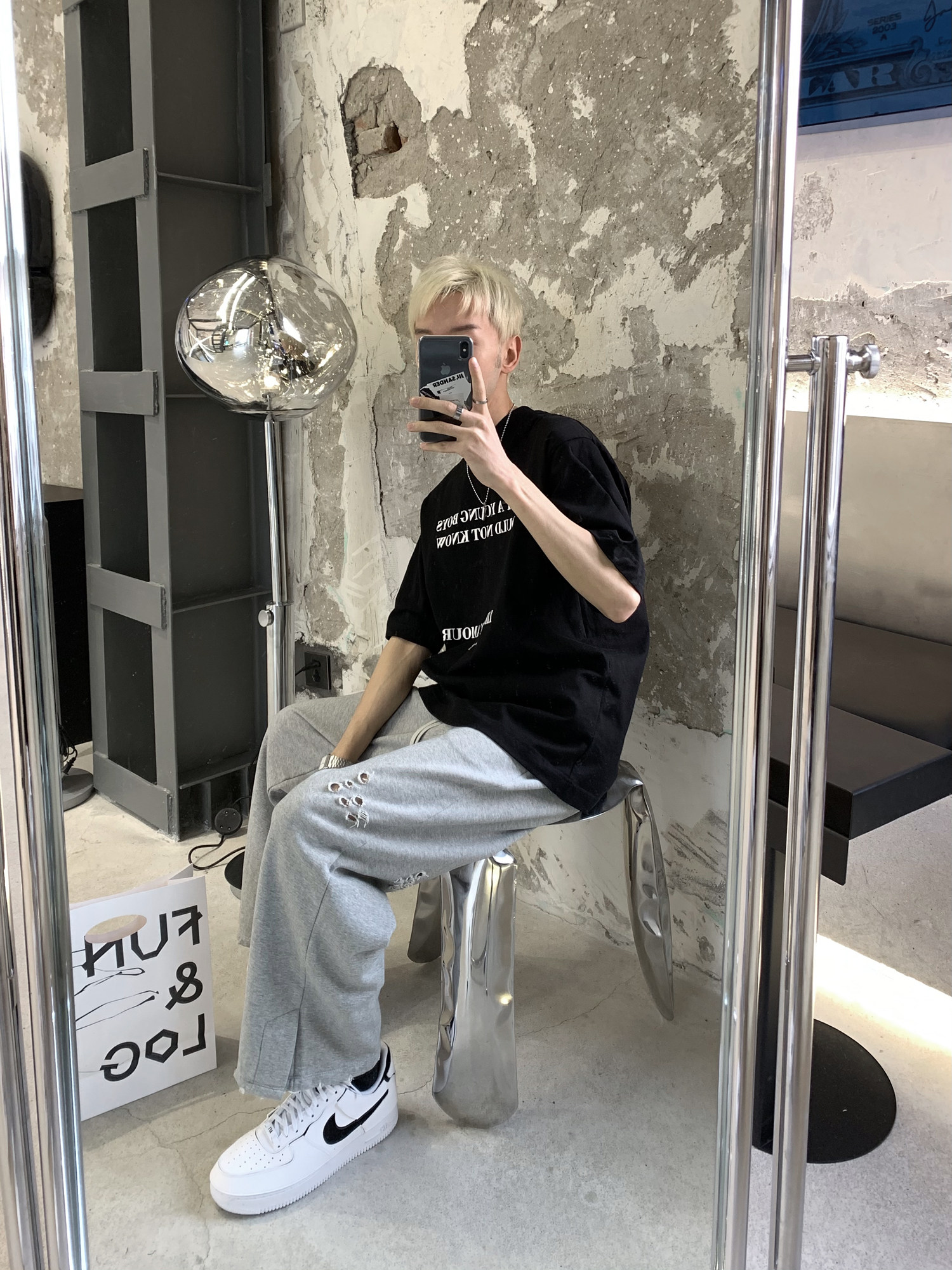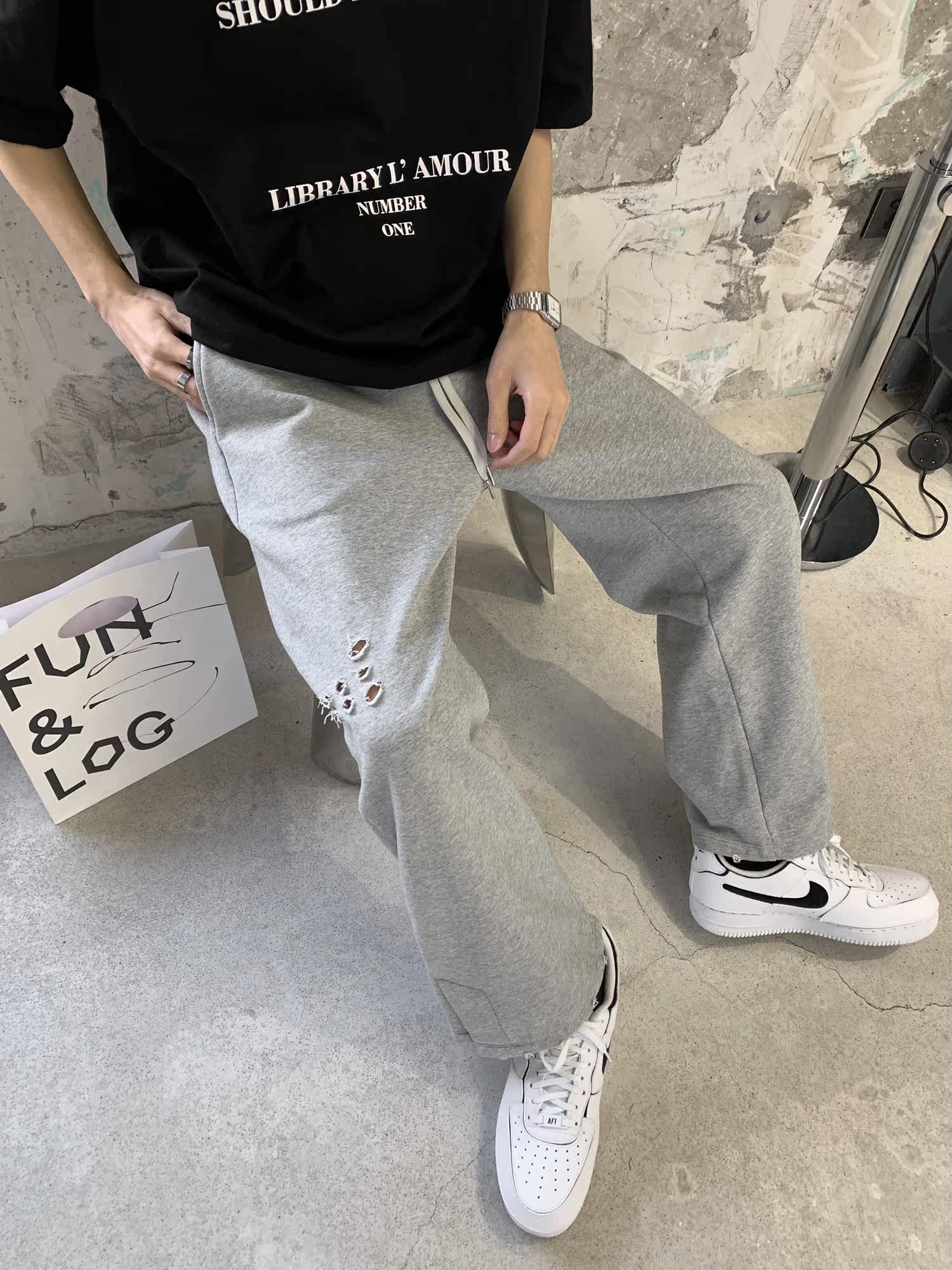 Sold out soon# Minority design hole drape loose straight wide-leg drawstring sweatpants men's white wide-leg trousers