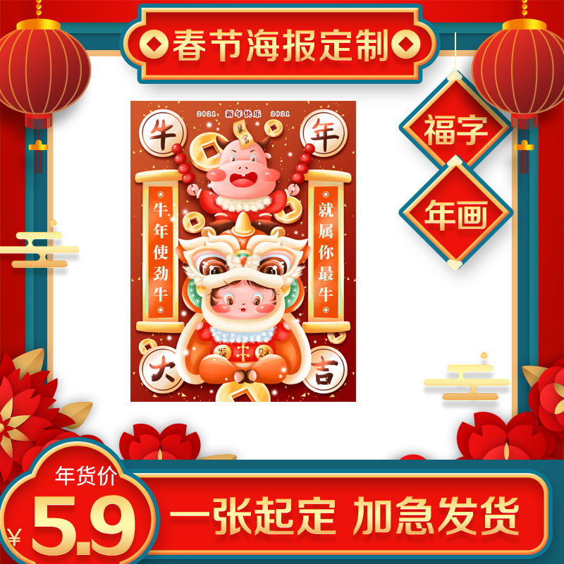 Square star poster custom dormitory couplet door sticker New Year painting Wall calendar hanging painting 2021 Year of the Ox advertising sticker national tide
