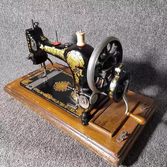 1920s British Antiques Jones Jones mechanical hand sewing sewing machine Colour printed with box accessories All