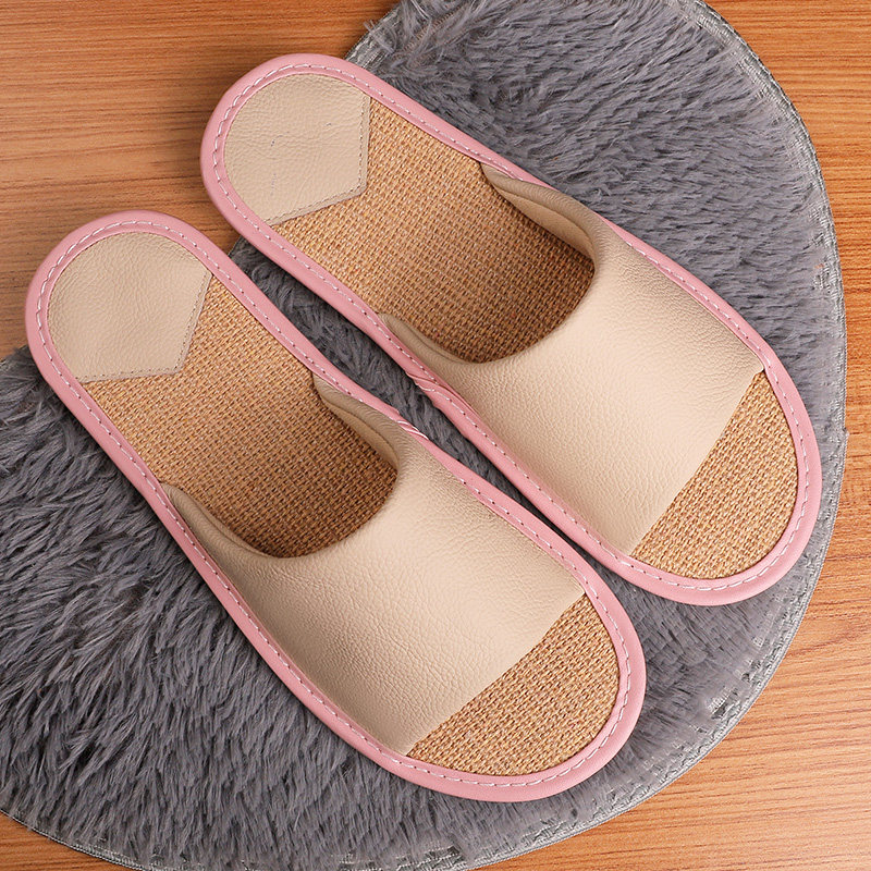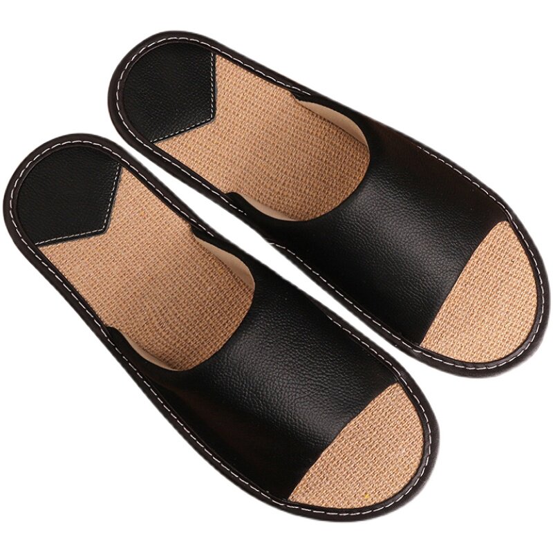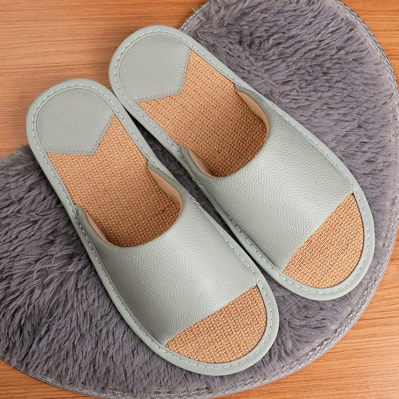 Cow Leather Linen Home Slippers Female Summer Home Indoor Bedroom Non-slip Deodorant Soft Bottom Genuine Leather Sandals for Men Home