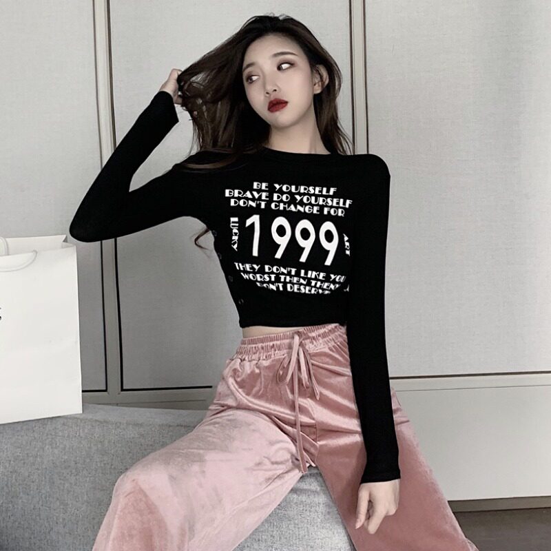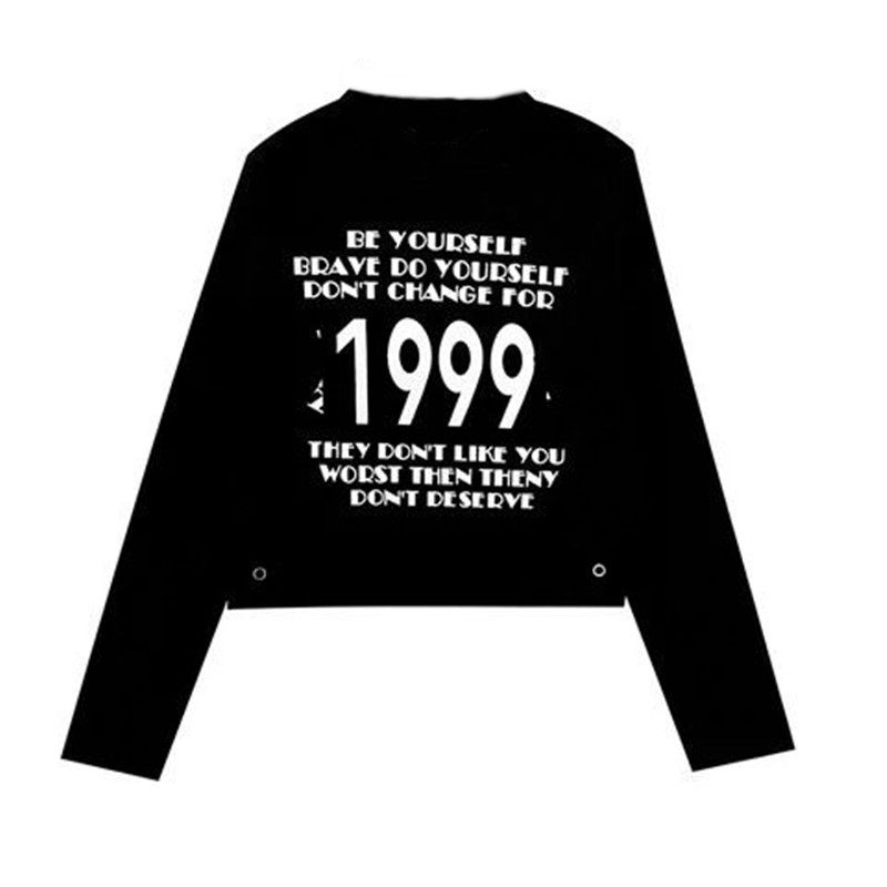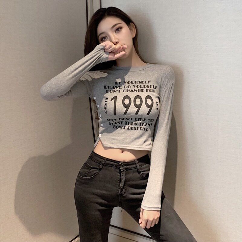 Vanya round-collar blouse in autumn and winter repair with short letter printing elastic long sleeve T-shirt