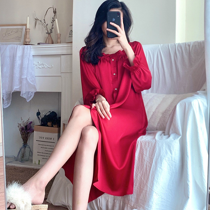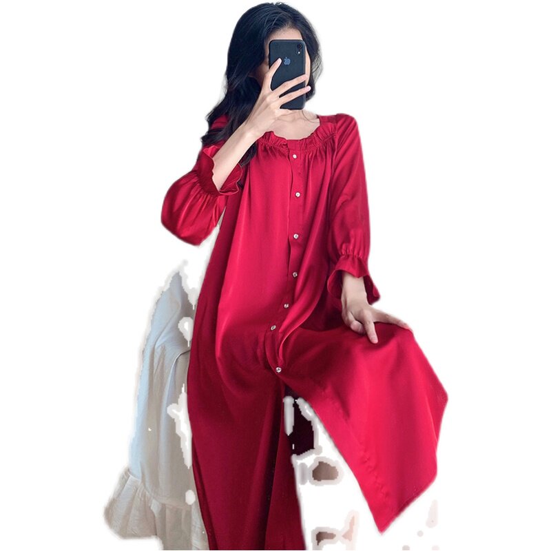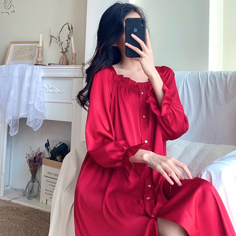 Red Pyjamas Women's Life Spring Autumn Long Sleeves Slim Loot Style Palace Wind Ice Silk Sleeping Dress Sexy medium long version