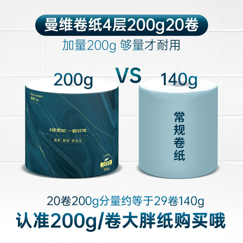 Manvey paper roll 200g large roll of toilet paper 4 layer thickening flush, dissolved toilet paper 60 rolls of complete box