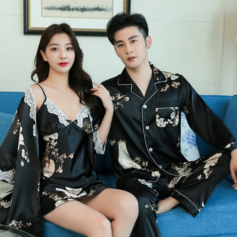 Sleepwear Spring Autumn Silk Lovers Sleepwear Women Harnesses Sleeping Skirts Two Sets Summer Thin Men's Ice Silk Sleepwear Suits