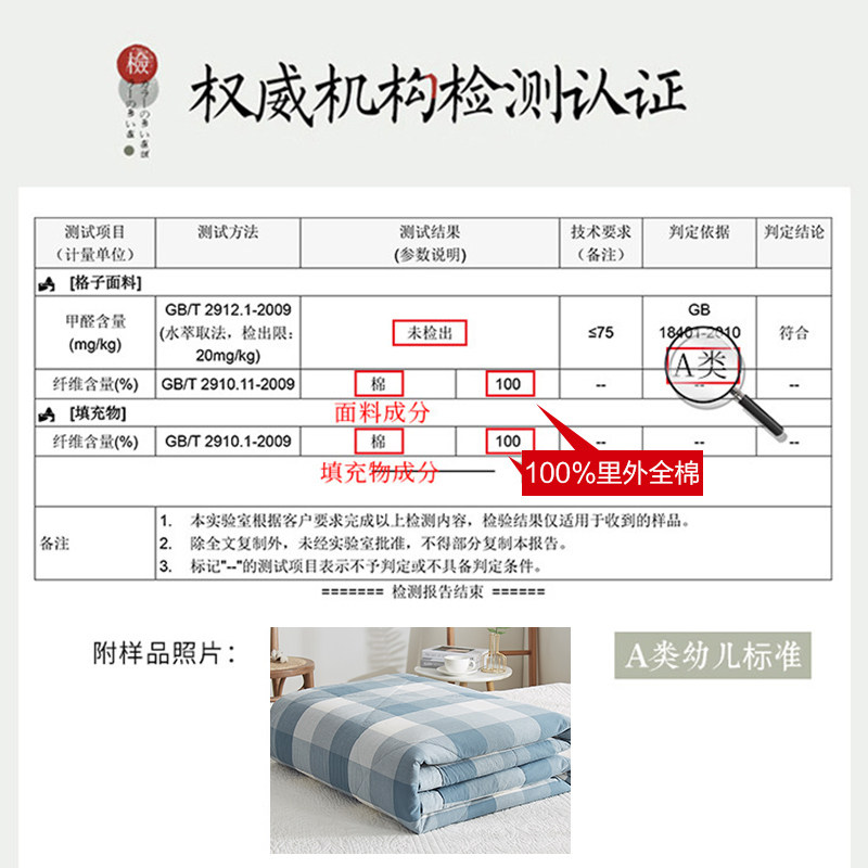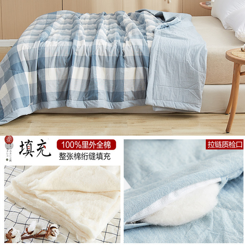 150x200cm (single summer cool quilt) 100% cotton inside and out comfortable soft naked sleeping skin-friendly 180x200cm (increased single quilt) 100% cotton inside and outside can not be machine washed balls do not knot 200X230cm (double summer cooling quilt) 100% inside and outside cotton Class A mother and baby class moisture absorption and breathability 220X240cm (double summer cooling quilt) 100% cotton inside and outside Gift bag + quality inspection report 1.2 meters bed three-piece set (150 * 200cm summer quilt + 200 * 230cm sheet + pillowcase * 1) 1.5m bed four-piece set (150*200cm summer quilt +200*230cm bed sheet + pillowcase pair) 1.8m bed four-piece set (180*200cm summer quilt+240*250cm bed sheet + pillowcase pair) 2.0m bed four-piece set (200*230cm summer quilt +240*250cm bed sheet + pillowcase pair) 2.2m bed four-piece set (220*240cm summer quilt + 240*250cm bed sheet + pillowcase pair) 150x200cm ( Spring and Autumn Quilt - approx. 4 kg) 150x200cm (Winter Quilt - Approx. 6 kg) 180x220cm (Spring and Autumn Quilt - Approx. 6.5 kg) 180x220cm (Thickened Winter Quilt - Approx. 8.5 kg) 200X230cm (Spring and Autumn Quilt - Approx. 6.7 kg) 200X230cm (Thickened Winter Quilt - Approx. 8.7 Kg) 220X240cm (Thickened Winter Quilt - Approx. 9 kg)