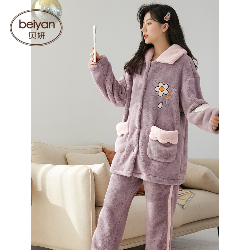 Beyan Sleeping Lady Winter Coral Suede Thickened Warm Plus Suede Cute Cartoon Embroidered Long-sleeved Home Suit Suit