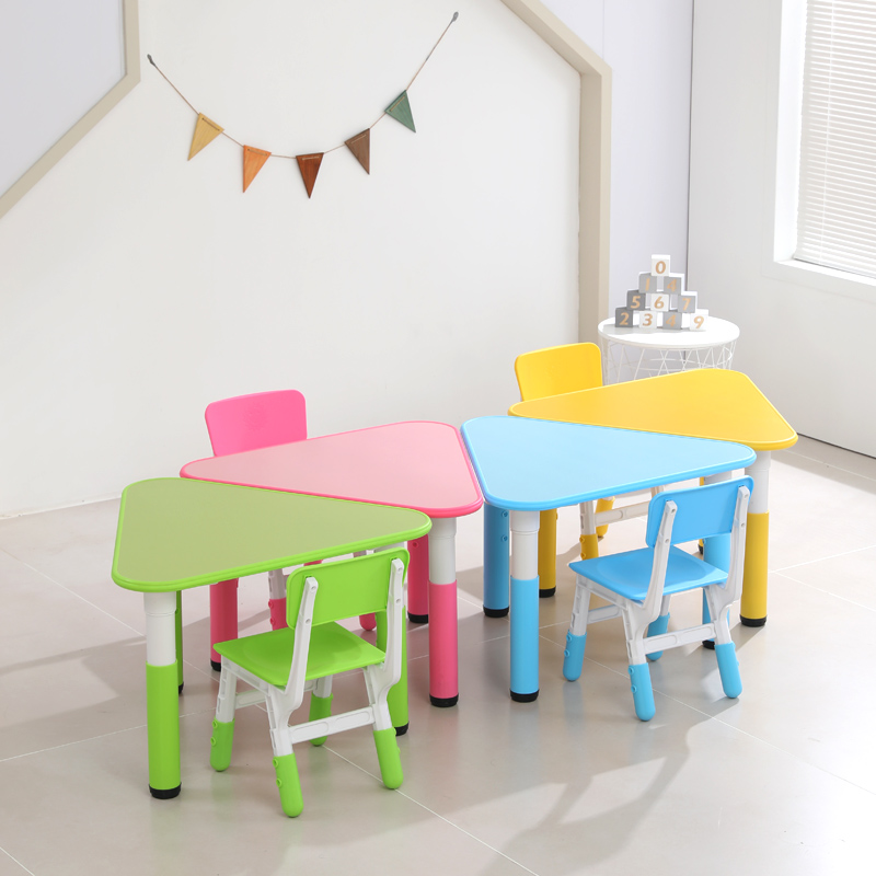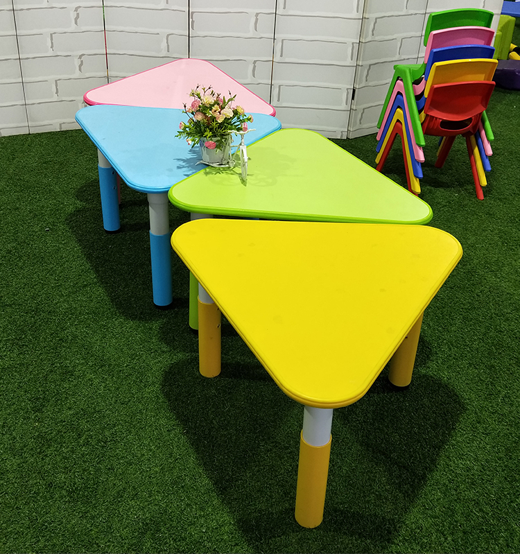 A full set of 6 triangle tables includes chairs A full set of 6 triangle tables does not include chairs Pink single table Sky blue single table Yellow single table Green single table Pink table 1 chair Yellow table 1 chair