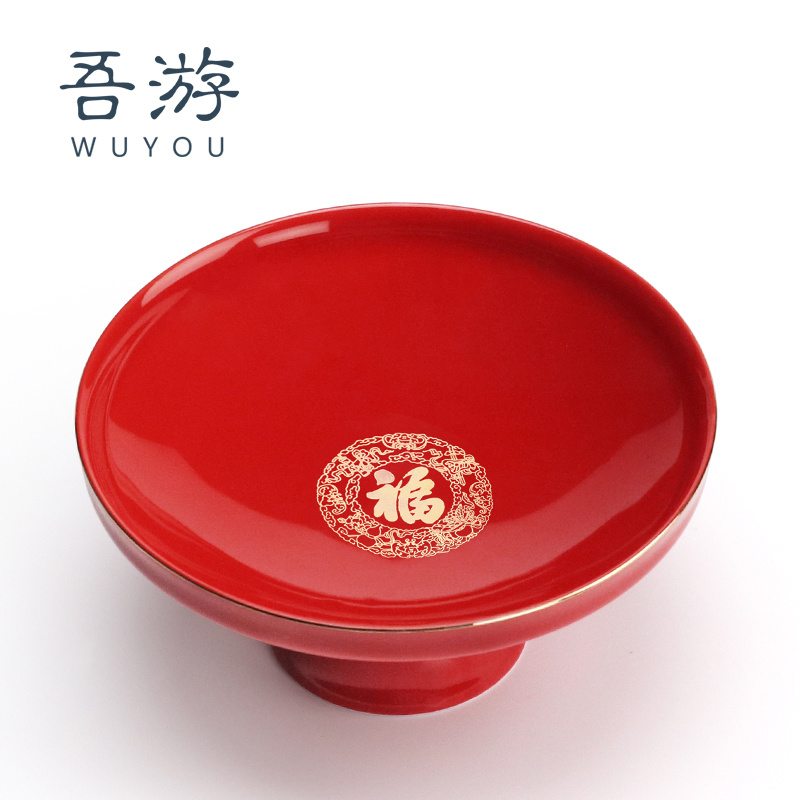 I travel Chinese festive high foot plate ceramic fruit plate dessert wedding candy plate fruit plate refreshment for Buddha basket tribute bowl