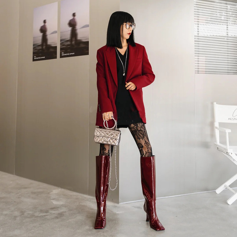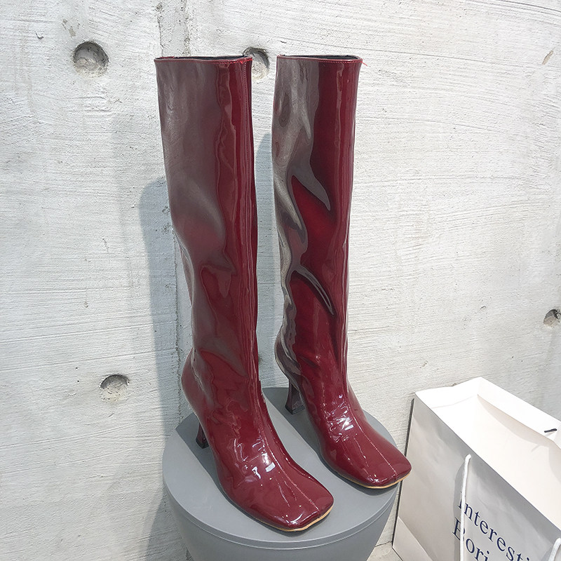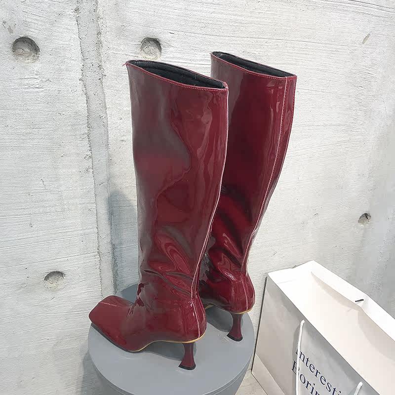 Axige same style long boots female 2021 new square toe high-heeled patent leather but knee wide boots thin boots