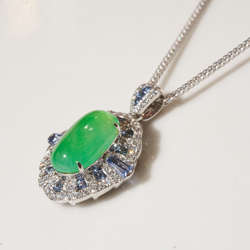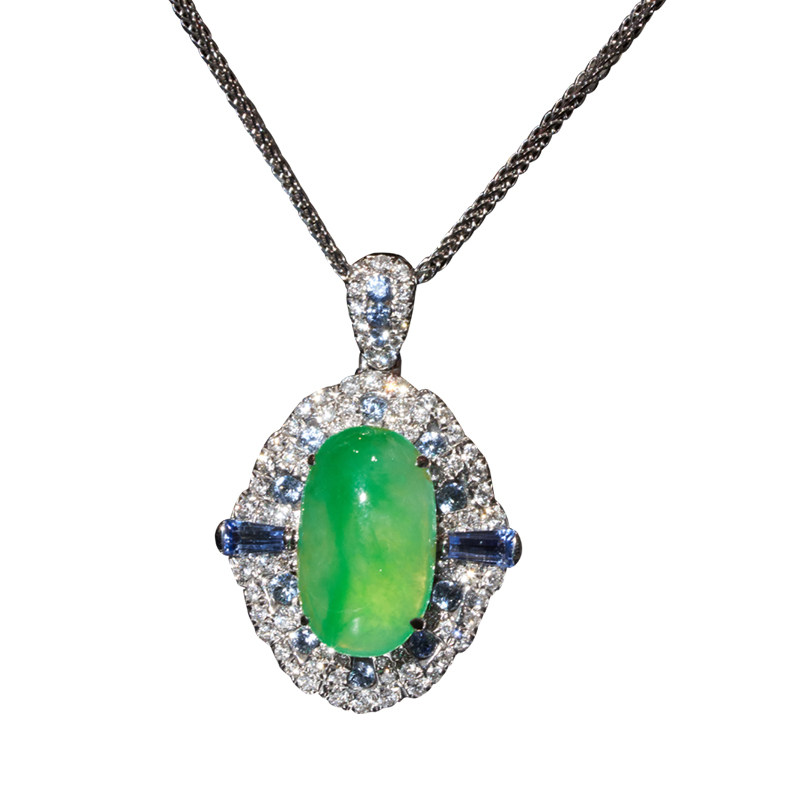 Guomao Jewelry Natural ice green full color jade pendant sapphire 18k gold diamond necklace inlaid custom