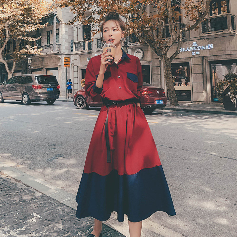 Red Long Sleeve Dress Women's Long Over the Knees Spring 2021 New Splicing Clash French Minor Platycodon Dresses