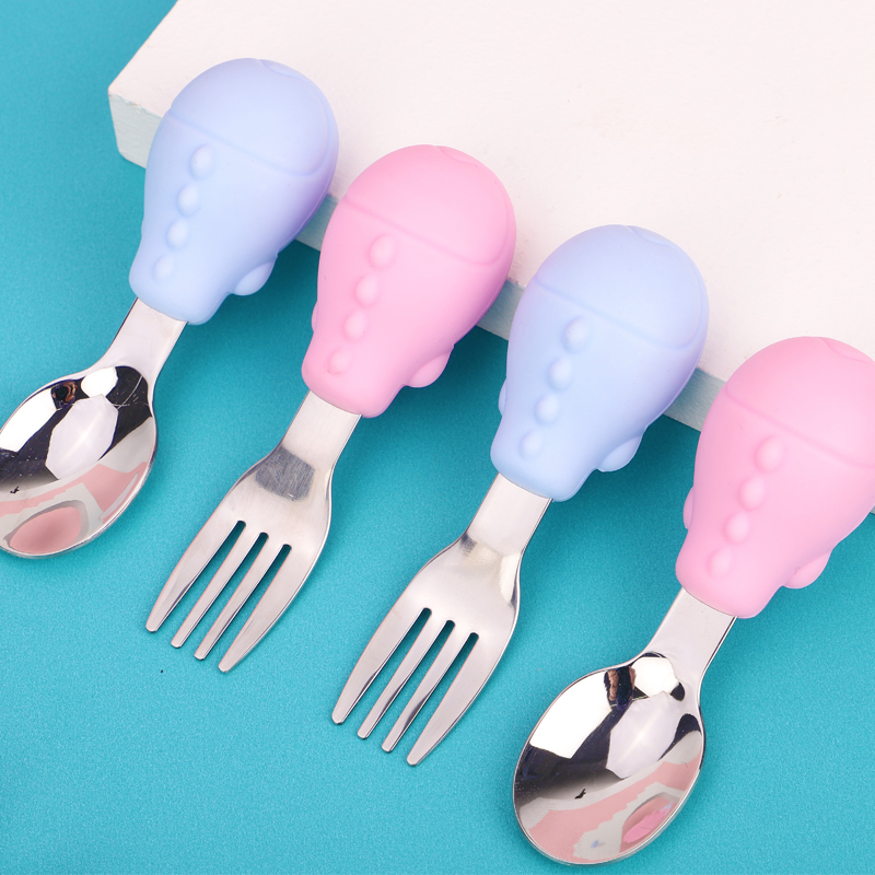 Baby learning to eat training spoon stainless steel short handle silicone 1 year old 2 and a half children's tableware baby fork spoon