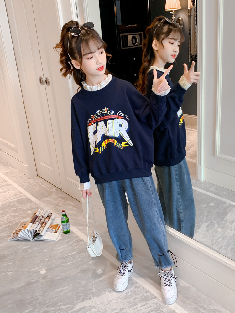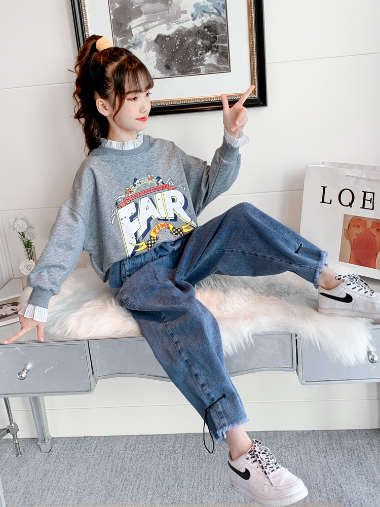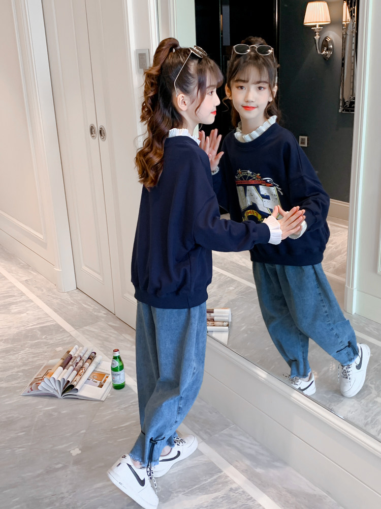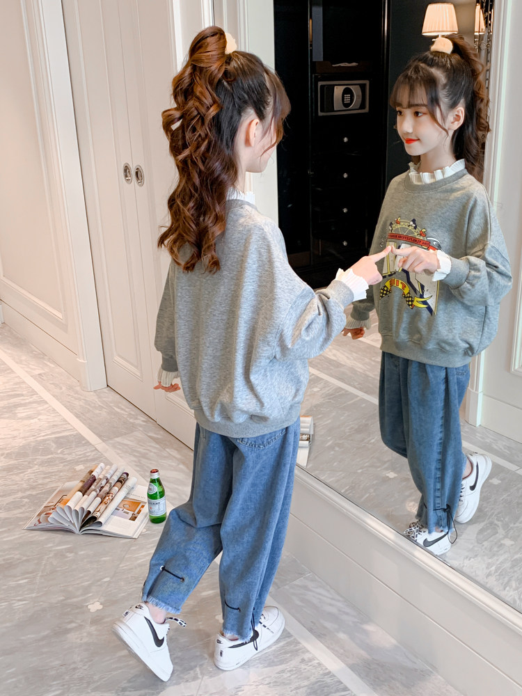 Children's Korean version of the suit girl's long-sleeved sweater spring and autumn fashion wide-leg jeans two-piece set in the big boy's western style