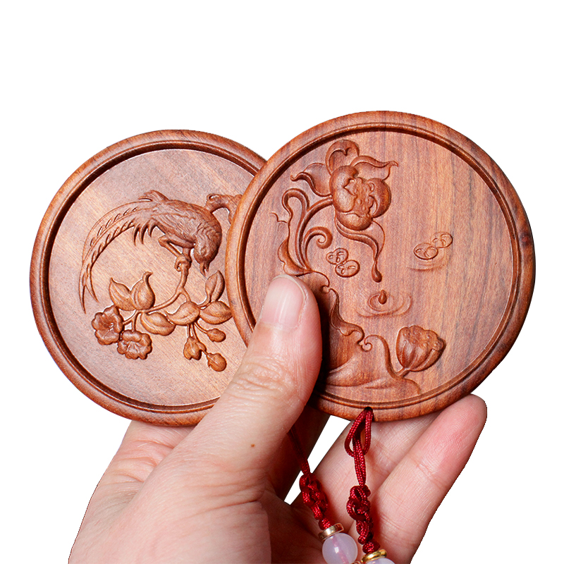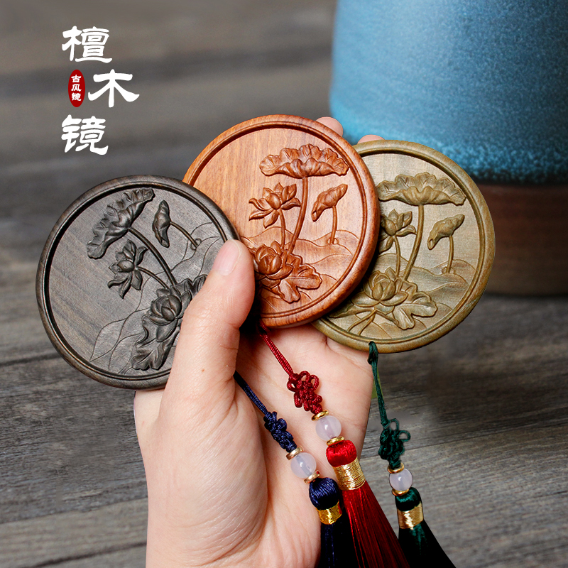 Chinese Wind Characteristics Gift Green Sandalwood Carry-on Makeup Mirror Ancient Wind Solid Wood Portable Engraving Small Round Mirror Sending the Old