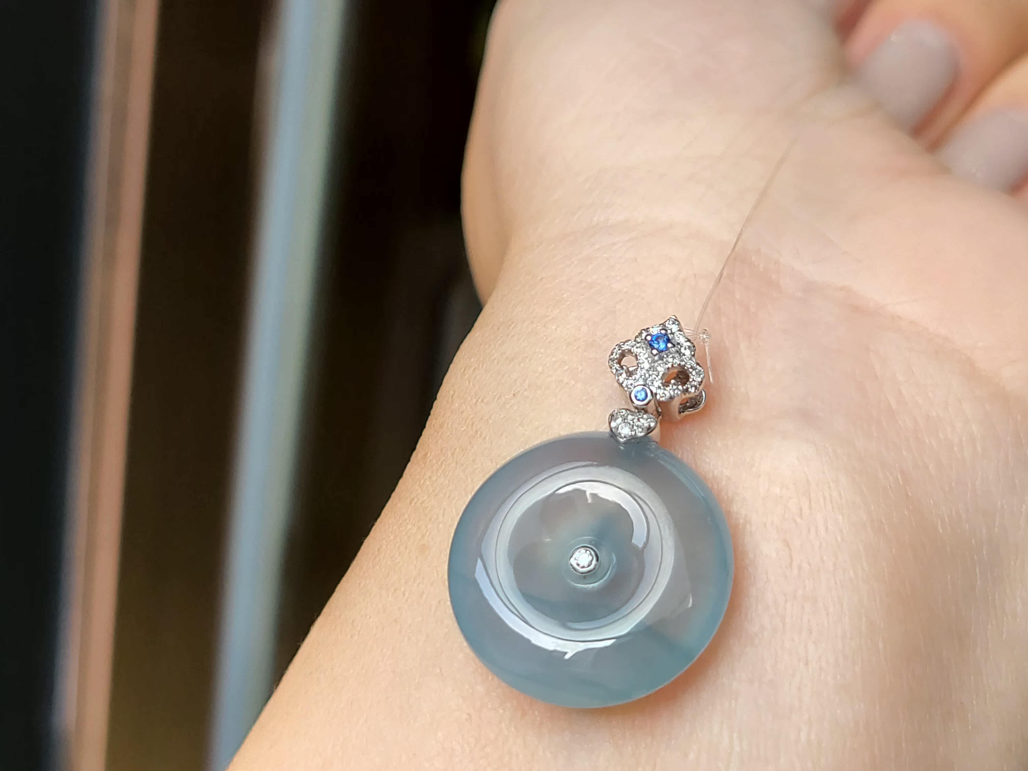 Myanmar natural jadeite A goods high ice blue background floating flower safety buckle pendant women's small button pendant 18K gold inlay