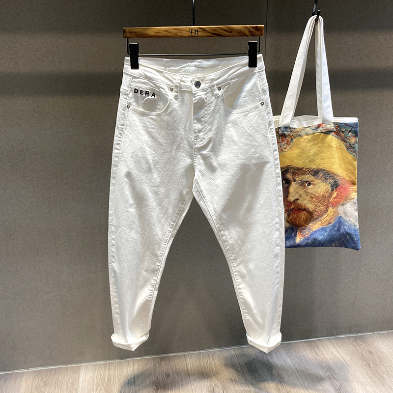 Ruffian handsome pants men's nine-point tapered pants white embroidery net red jeans men's slim feet trendy brand ins super hot