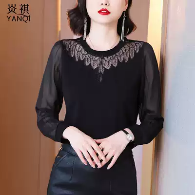 2021 autumn new mesh stitching pure cotton inner tie bottoming shirt women's black noble temperament T-shirt top small shirt