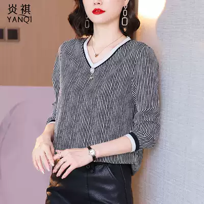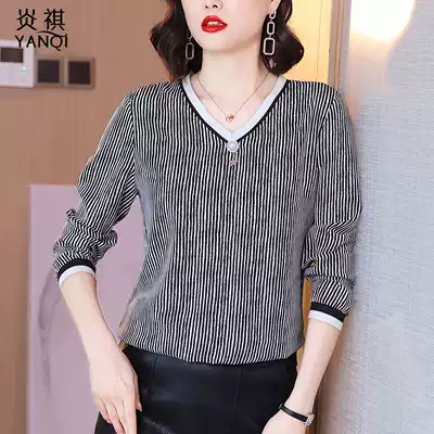 Loose Korean version of women's V-neck top small shirt 2021 autumn new black and white striped fashion long-sleeved chiffon shirt women