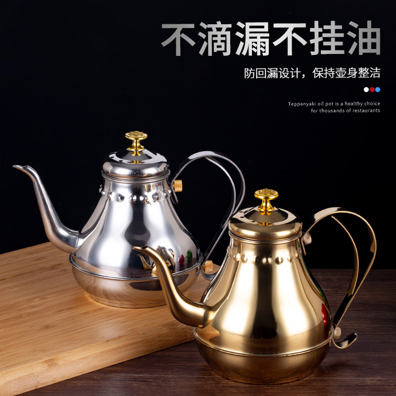1 5L long mouth silver oil pot (for Teppanyaki) 1 5L long mouth gold oil pot (for Teppanyaki) 1 2L short mouth silver water jug (with filter inside) 1 2L short mouth golden water