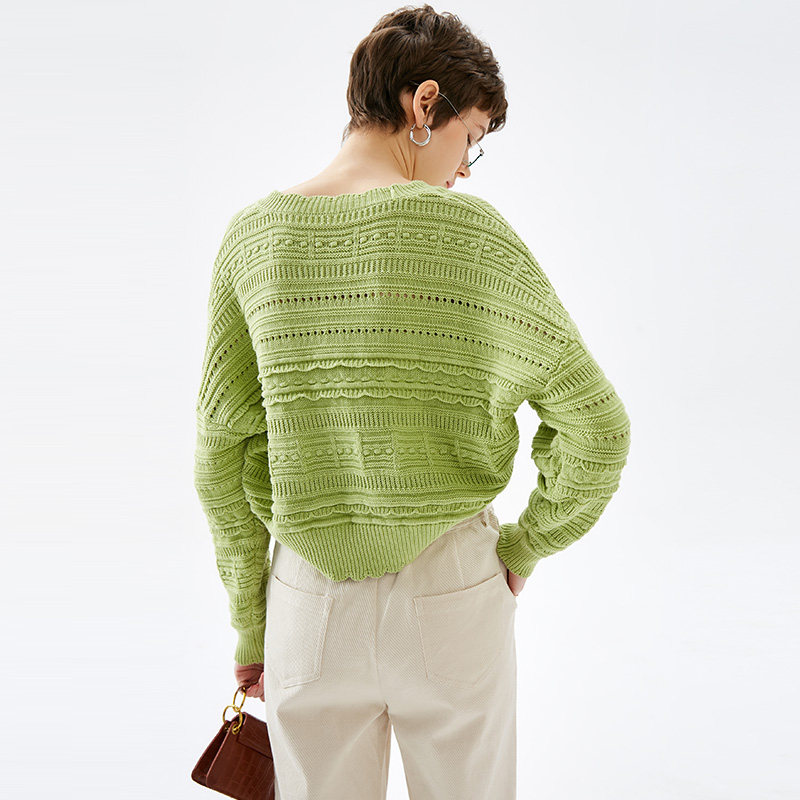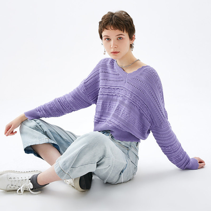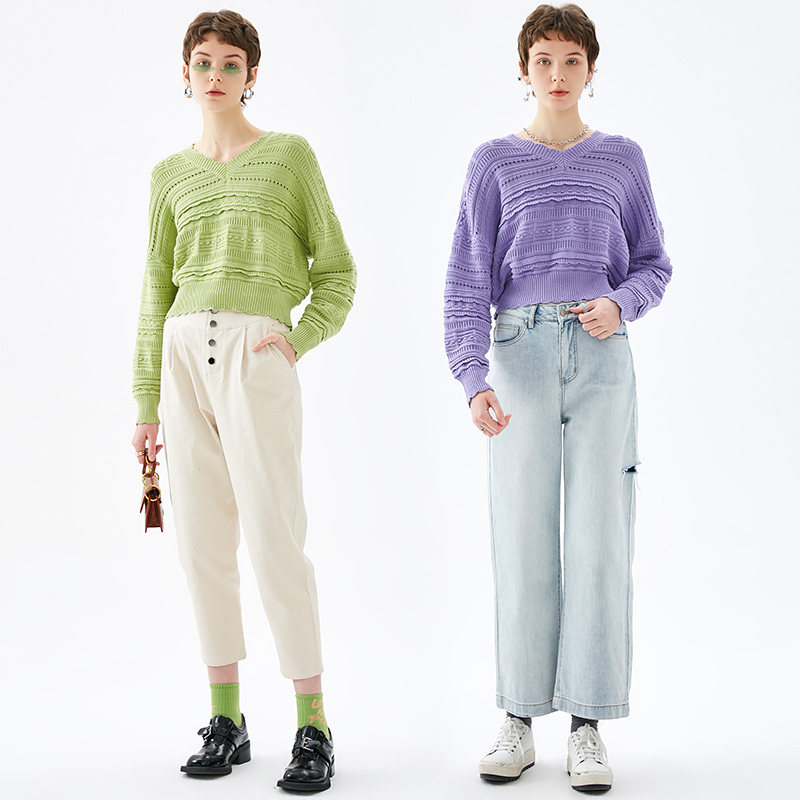 Jamor autumn new hollow pullover sweater women's design sense tops loose and versatile V-neck sweater tide