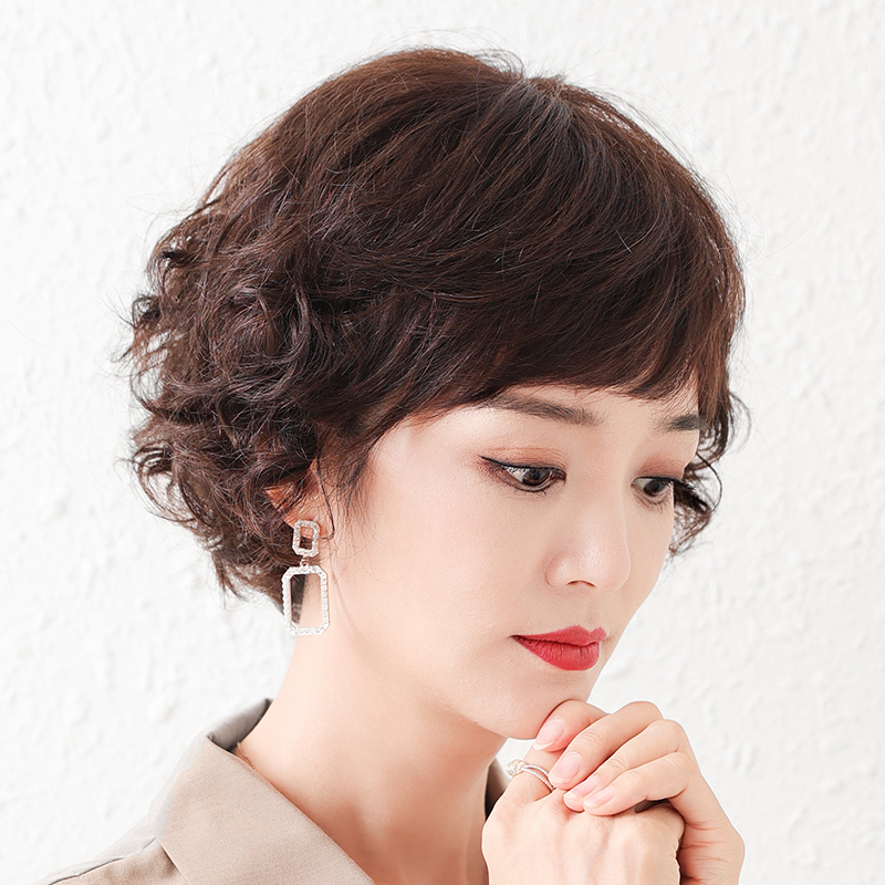 Wig short hair female wig real hair full live hair short curly hair bald head wig Lady middle-aged mother wig set
