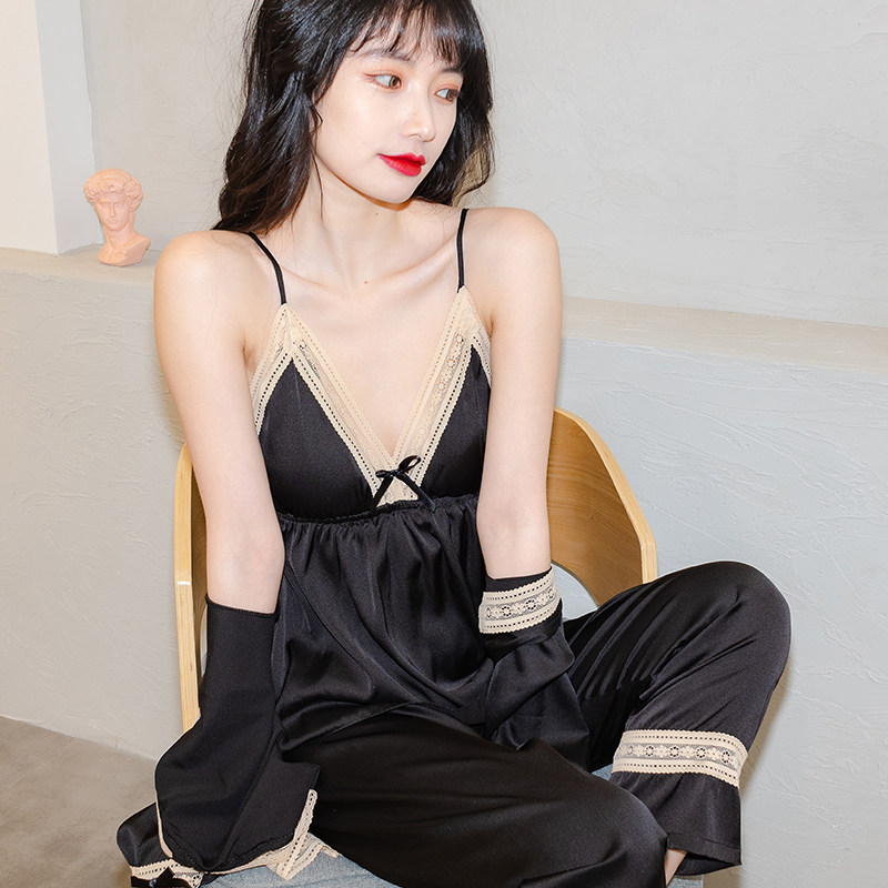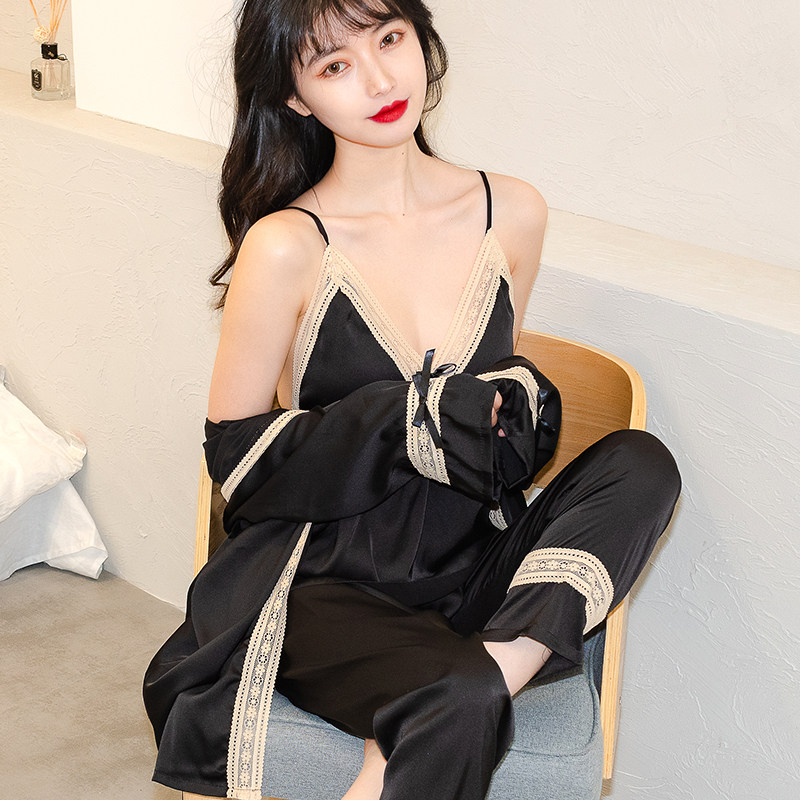 Silk pajamas women's 2022 new summer suspender nightgown three-piece suit ice silk home clothes women with chest pads