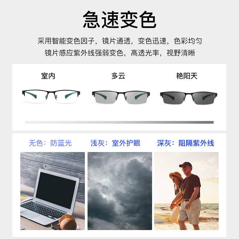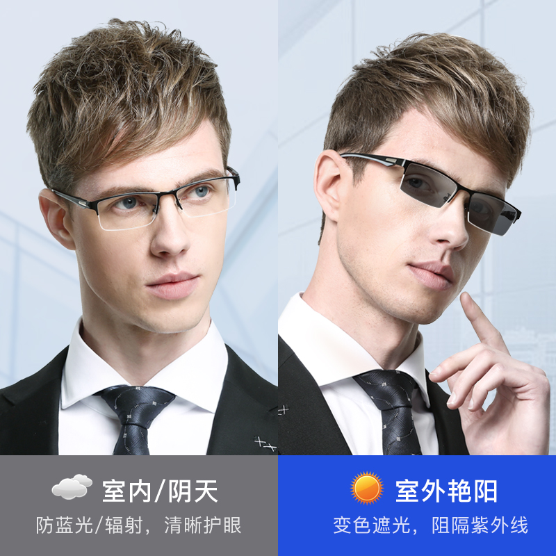Automatic photodiscoloration myopia glasses male anti-blue light anti-radiation fatigue can be equipped with degree half frame goggles tide