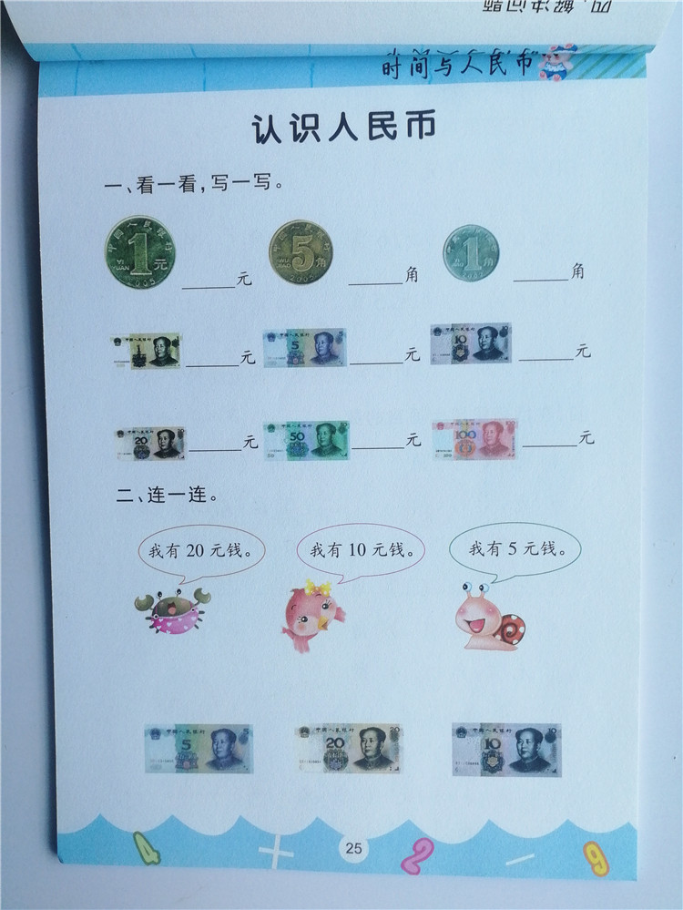 Recognition time and RMB conversion of children's math meta-money calculation topic 10-20 plus subtraction application