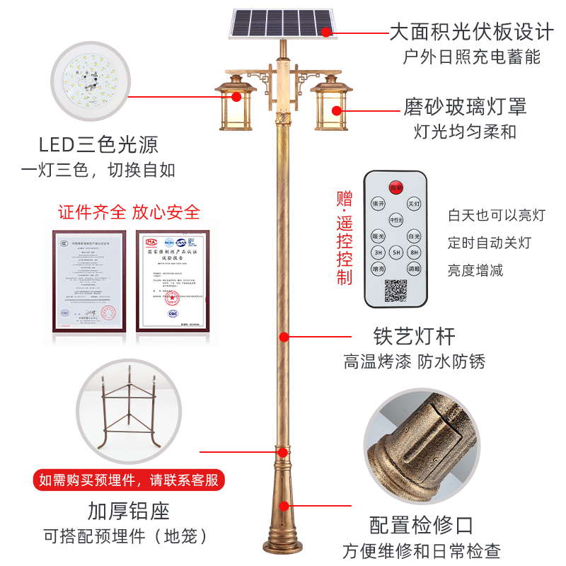 Wu Dalang 2.7 meters high black aluminum pole (solar model with remote control three-color light) Wu Dalang 2.9 meters high bronze aluminum pole (connecting model with LED bulb) Wu Dalang high