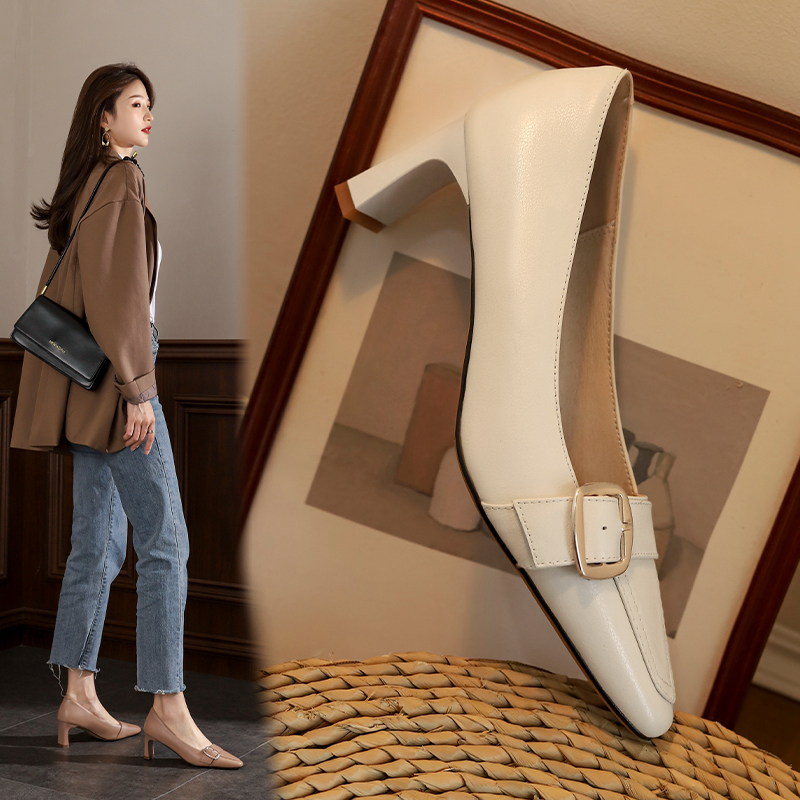 GANAIER ultra-dominant genuine leather light extravagant small square scalp with buckle flat coarse heel single shoe woman apricot high heel shoes