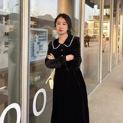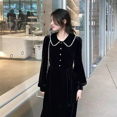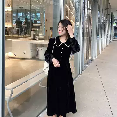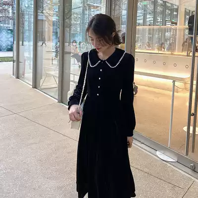 Feier black dress female 2021 spring and autumn new Korean version of the temperament slim and thin doll collar velvet skirt