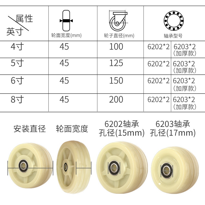 3" single wheel blade x4 (classic with bearings) 4" single wheel blade x4 (classic with bearings) 5" single wheel blade x4 (classic with bearings) 3" single wheel blade x4 (thickened with bearings) 4" single wheel blade x4 (thickened with bearings) 5" single wheels x4 (thickened with bearings) Type A 4" single wheels x4 (heavy with bearings) A type 5" single wheels x4 (heavy duty with bearings) A type 6" single wheels x4 (heavy duty with bearings) A type 8" single wheels x4 (heavy duty belt bearings) Type B 4" single wheels x4 ( Heavy-duty GB with bearing) B-type 5-inch single-wheel piece x4 (heavy-duty GB with bearing) B-type 6-inch single-wheel piece x4 (heavy-duty standard with bearing) B-type 8-inch single-wheel piece x4 (heavy-duty standard with bearing) Type C 4-inch single wheel x4 (GB thickened with bearing) C-type 5-inch single wheel x4 (GB thickened with bearing) C-type 6-inch single wheel x4 (GB thickened with bearing) C-type 8-inch single wheel x4 (GB thickened with bearing) 8-inch flower heart ordinary model 10 inch flower heart ordinary model 12 inch flower heart ordinary model 8 inch solid reinforcement 10 inch solid reinforcement 12 inch solid reinforcement 5 inch 40 thick core nylon 5 inch 50 thick core nylon 8 inch 40 thick core nylon 10 inch 45 thick core nylon