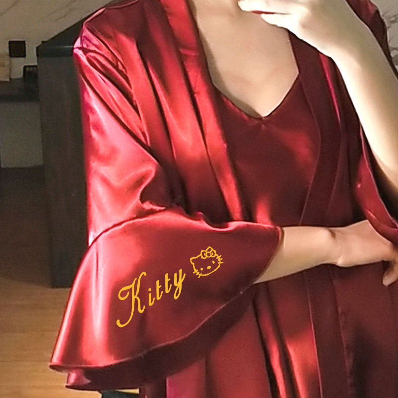 Dressing gown female bride bridesmaid red nightgown horseshoe sleeve sexy bathrobe custom embroidery embroidery Japanese-style Korean pajamas