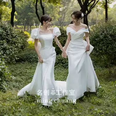 French light wedding dress 2021 new satin retro simple atmosphere French welcome yarn temperament bride super fairy