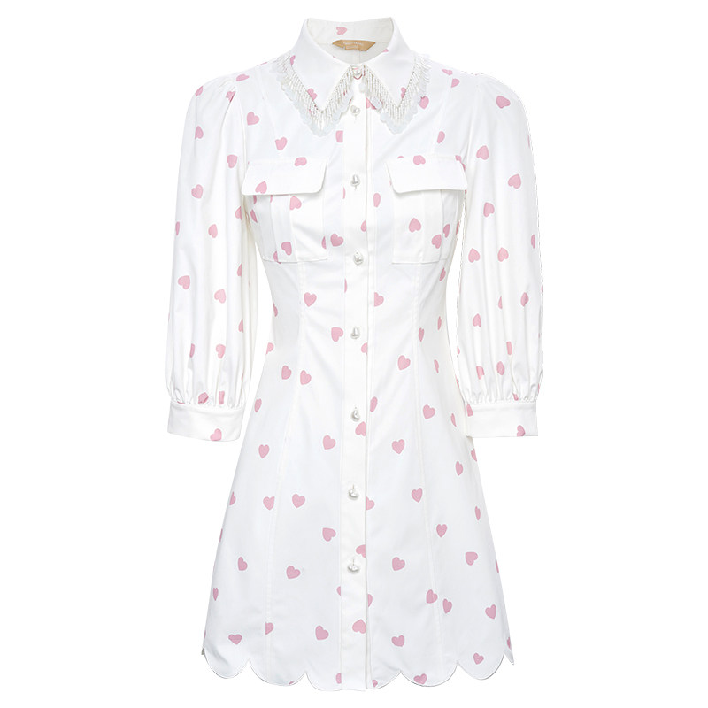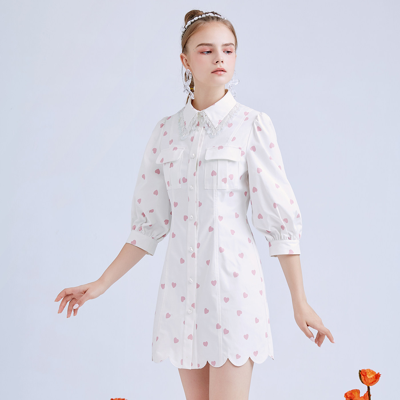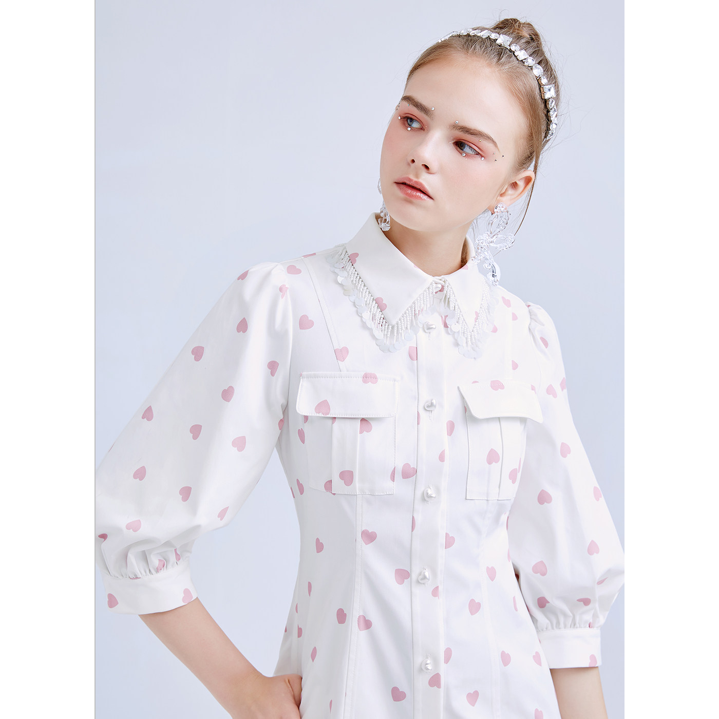 Sugar Force Spring Autumn Season Sweet Beauty Ladies 70% Sleeves Love Printed Streaming Subright Sheet Decoration Turned Collar Shirt Foreign Dress Woman