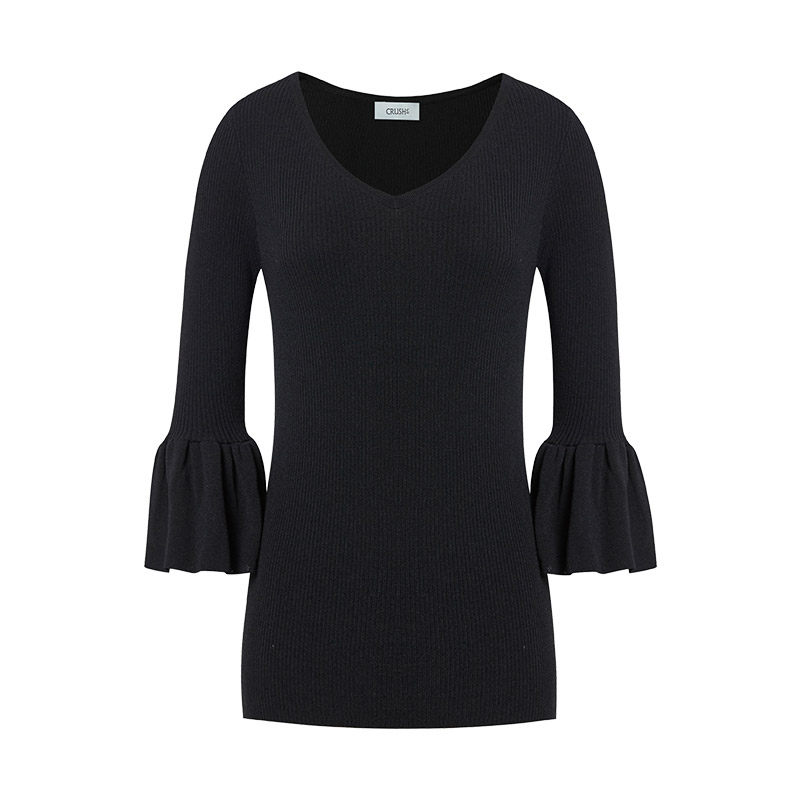 CRUSH Collection V-neck trumpet sleeve ribbed top early autumn women's texture design knitted pullover