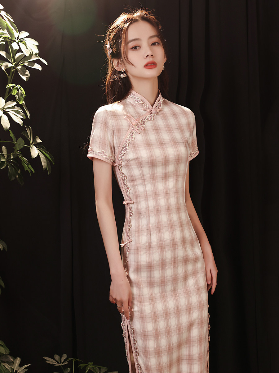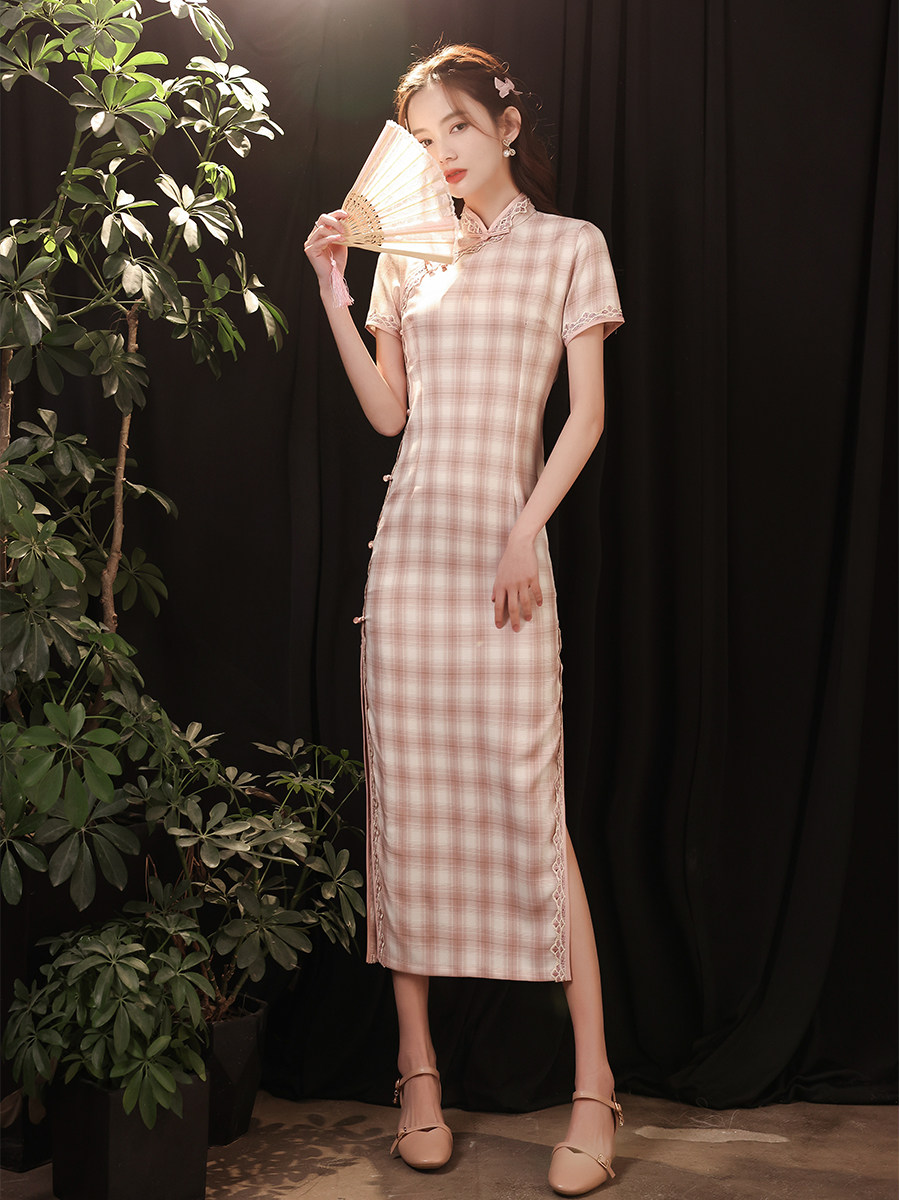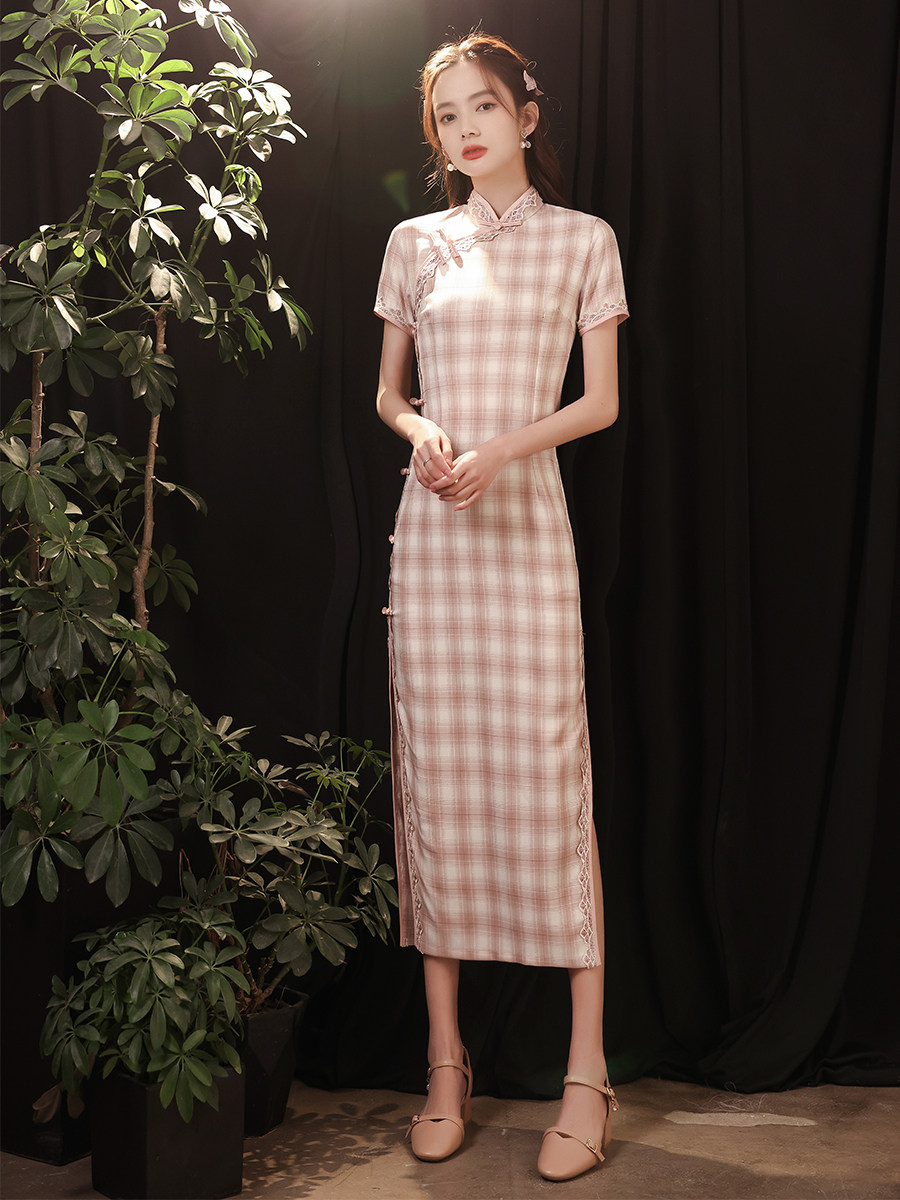 Plaid cheongsam 2022 new long section female summer young girl literature and art daily retro improved dress