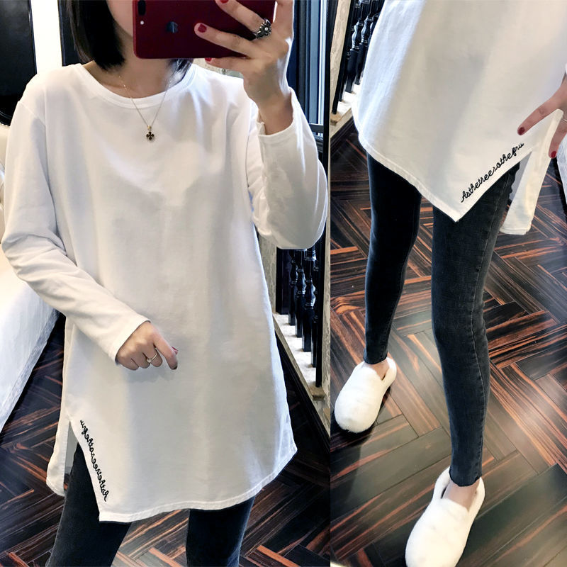 Korean white split T-shirt female spring and autumn Korean version of retro loose medium and long version bottoming shirt pullover long sleeve jacket tide