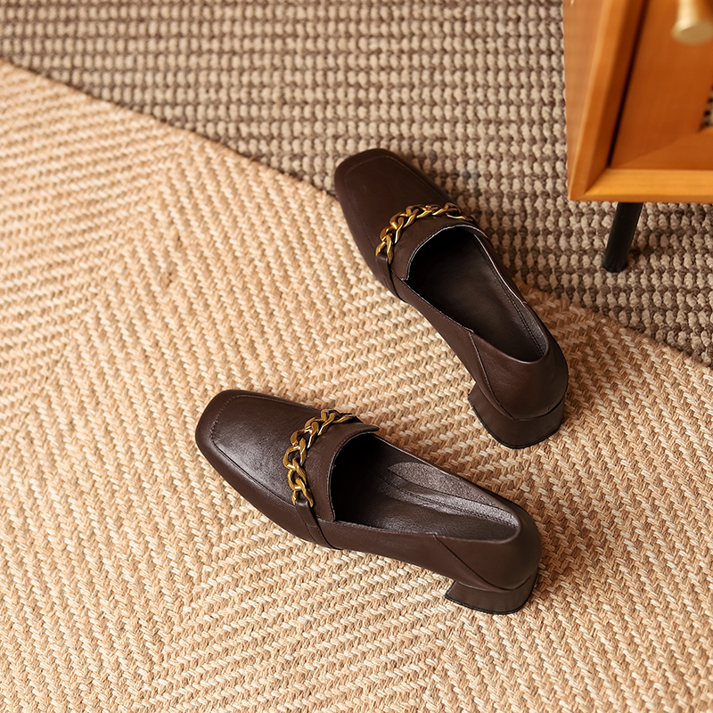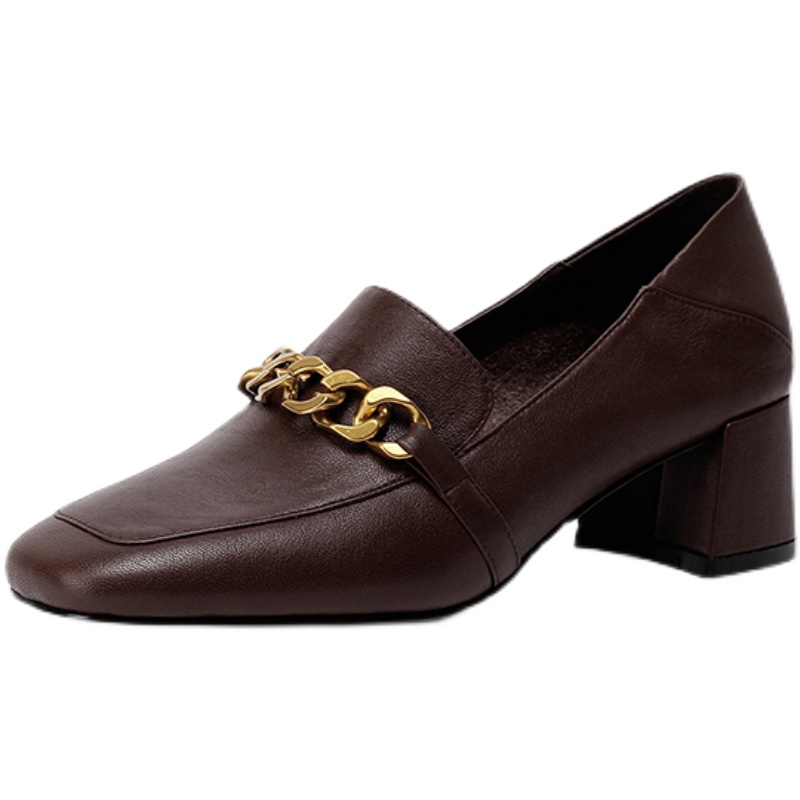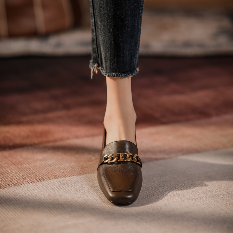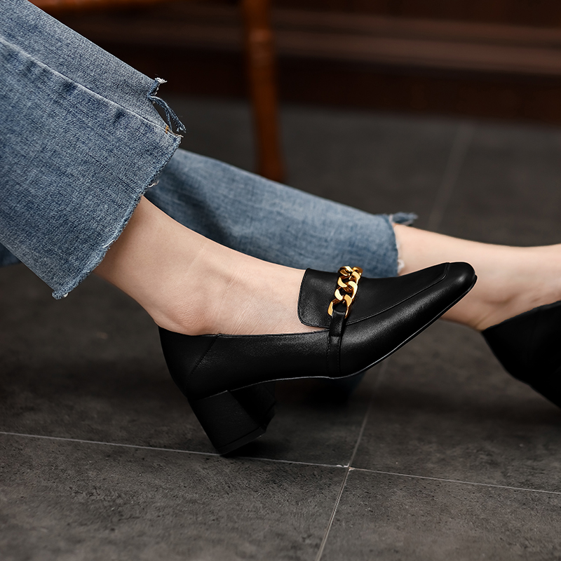 Lefu shoes are real leather English wind 2021 spring style of heel shoes, thick heel shoes, head of female shoes