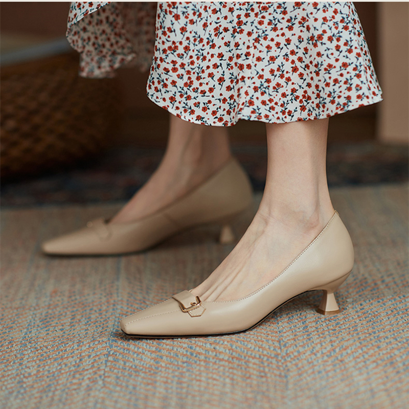 GANAIER niche design leather low-heeled shoes women's commuter style square head shallow mouth in the heels all-match high-heeled shoes