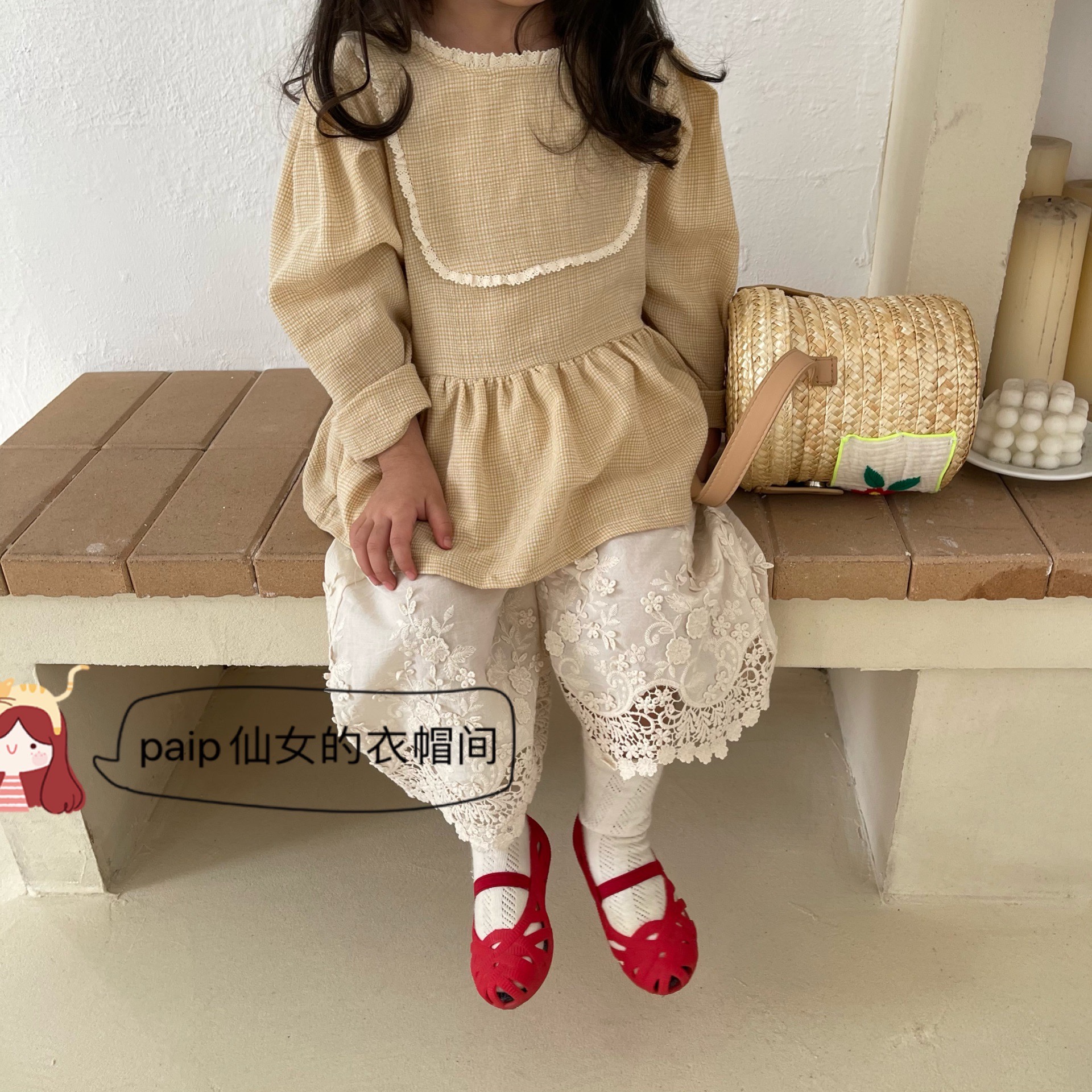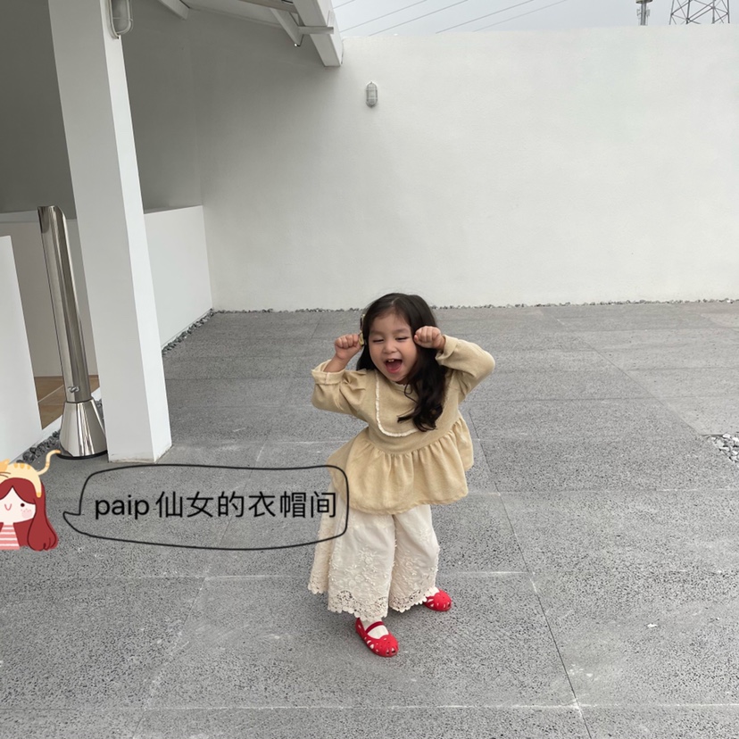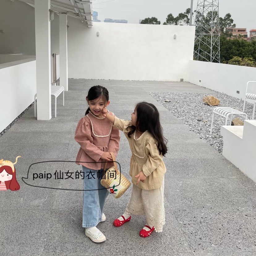 2021 new apricot spring and autumn children's clothing puff sleeves solid color tops long-sleeved lace wide-leg pants cotton and linen long culottes