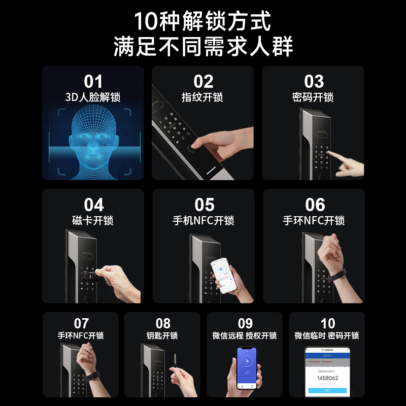 Q9 gray (upgraded big handle + cat's eye big screen + NFC unlock + fully automatic + 99% of the doors). K7Q dark dial color (cat's eye large screen + full automatic + suitable for 99% of the doors). K7P red bronze (cat's eye large screen + fully automatic + suitable for 99% of the doors). T9 (Cat's Eye Big Screen + Big Handle + Remote Unlock + Fully Automatic + 99% Of Doors). X9 (3D face recognition + NFC unlock + remote unlock + fully automatic + large handle + suitable for 99% of doors). X9S (3D face recognition + visual cat's eye + NFC unlock + fully automatic + 99% of the door + large handle)
