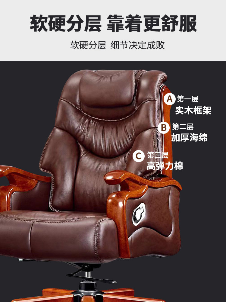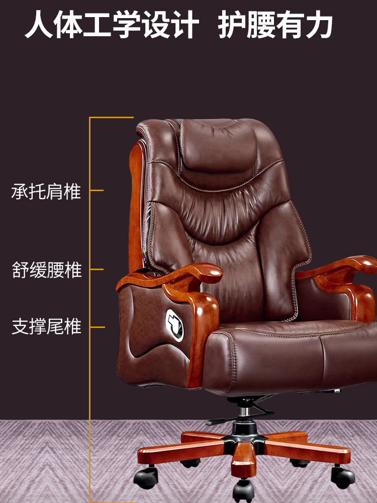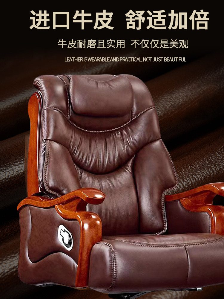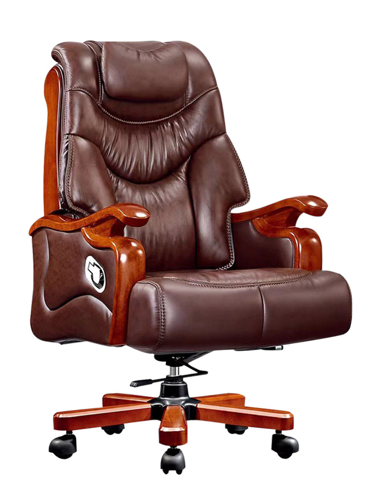 Leather boss chair home high-end reclining office chair cowhide Chinese style solid wood business office executive chair