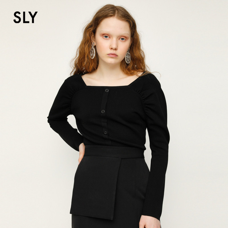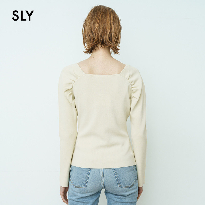 SLY2021 summer new simple solid color square collar pleated bubble sleeve sweater women 030ESZ70-3710