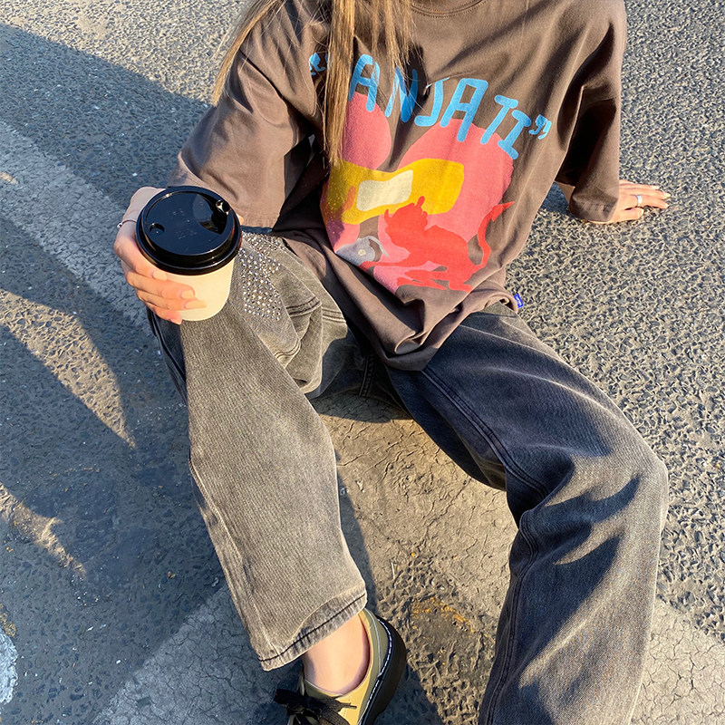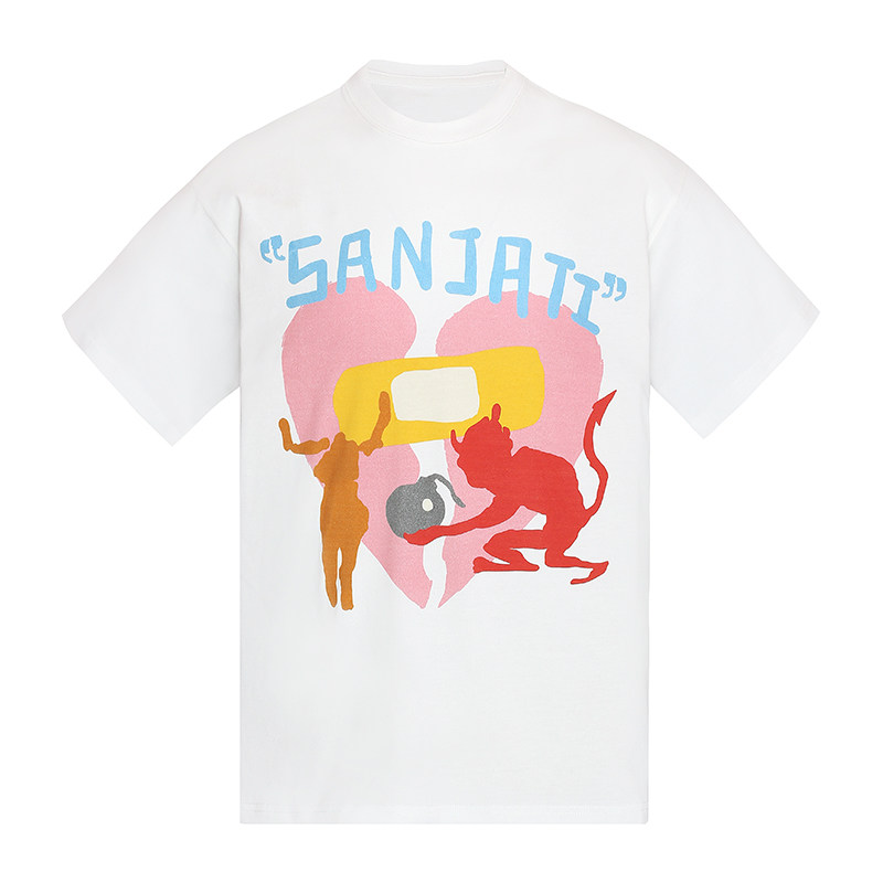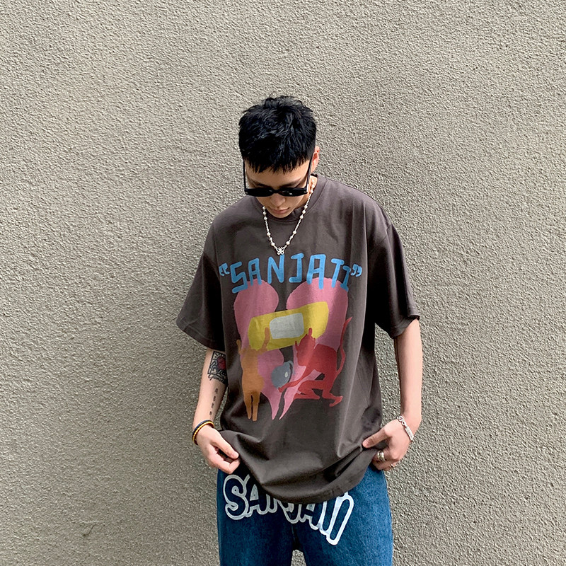 Sanjati crane love heartbroken character graffiti printing loose round neck short-sleeved male and female hip-hop t-shirt national tide